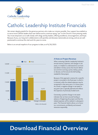We are deeply grateful for your generosity and partnership in advancing the mission of Catholic Leadership Institute to ignite parishes, embolden the clergy, and forge the future.